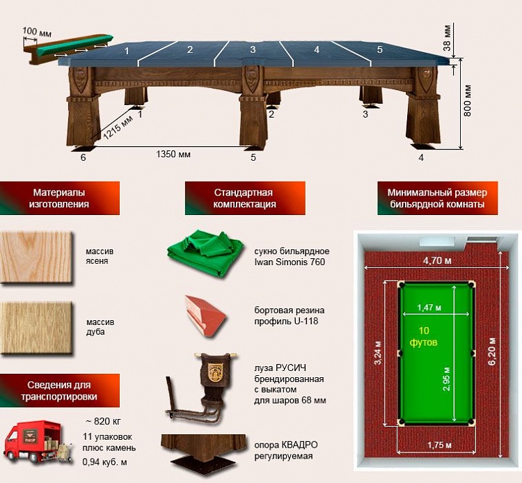 Бильярдный стол для русской пирамиды "Русич" (10 футов, ясень, 38мм камень)