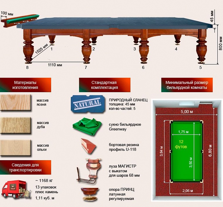 Бильярдный стол для русской пирамиды "Магнат-Люкс" (12 футов, ясень, 45мм камень)