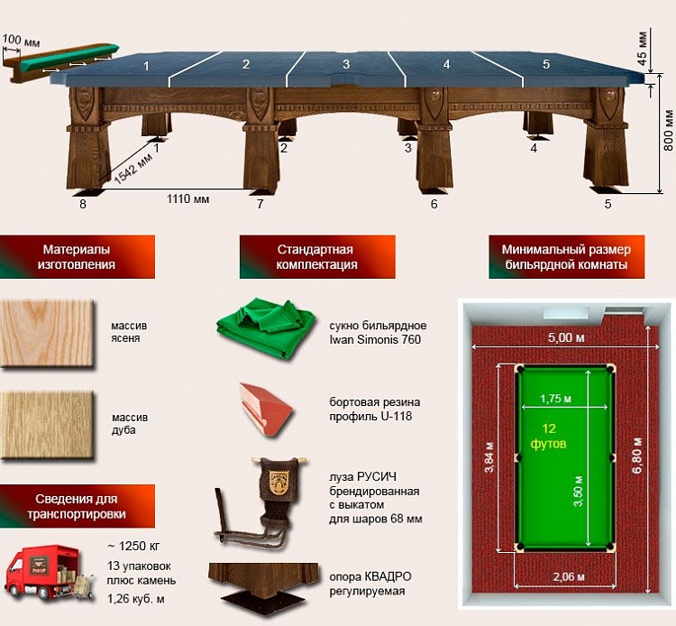 Бильярдный стол для русской пирамиды "Русич" (12 футов, ясень, 45мм камень)