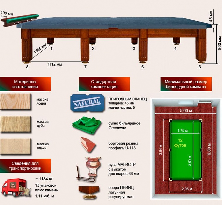 Бильярдный стол для русской пирамиды "Спортклуб" (12 футов, дуб, 45мм камень)