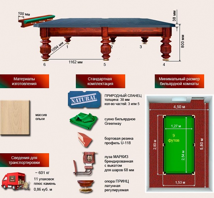 Бильярдный стол для русской пирамиды "Маркиз" (9 футов, ольха, борт ясень, 38мм камень)